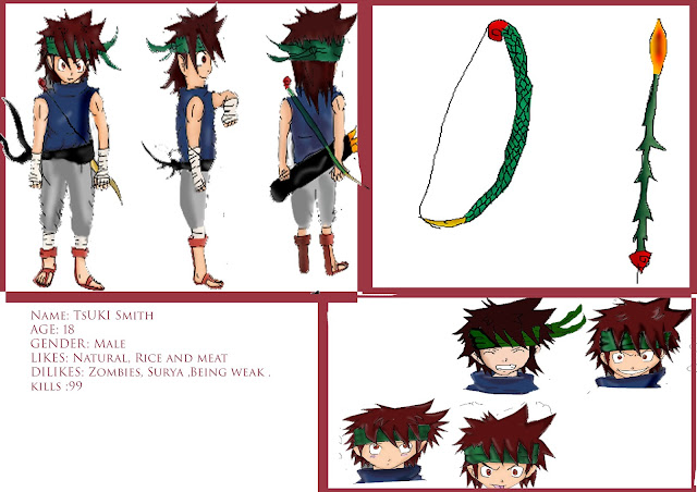 This is my first character his name called Tsuki (means"Moon " in Japanese ) smith .I only colored half of them ,as I don't have much time to colour in as the weeks are getting closer.I like this character a lot because the drawing are my original style and I found out that I have got other styles then my previous styles. The inspiration on the character is from Metal Solid Gear with the headband because it one my favorite games out there because it has a really good story line.The character sheet is really cool too but it would look really cool when it is be polished in illustrator.